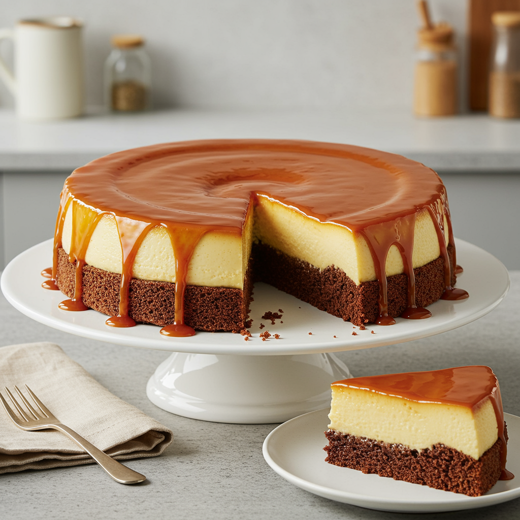 Uma sobremesa deliciosa e prática, com duas camadas distintas: um bolo fofinho e um pudim de leite super cremoso, banhado em calda de caramelo.