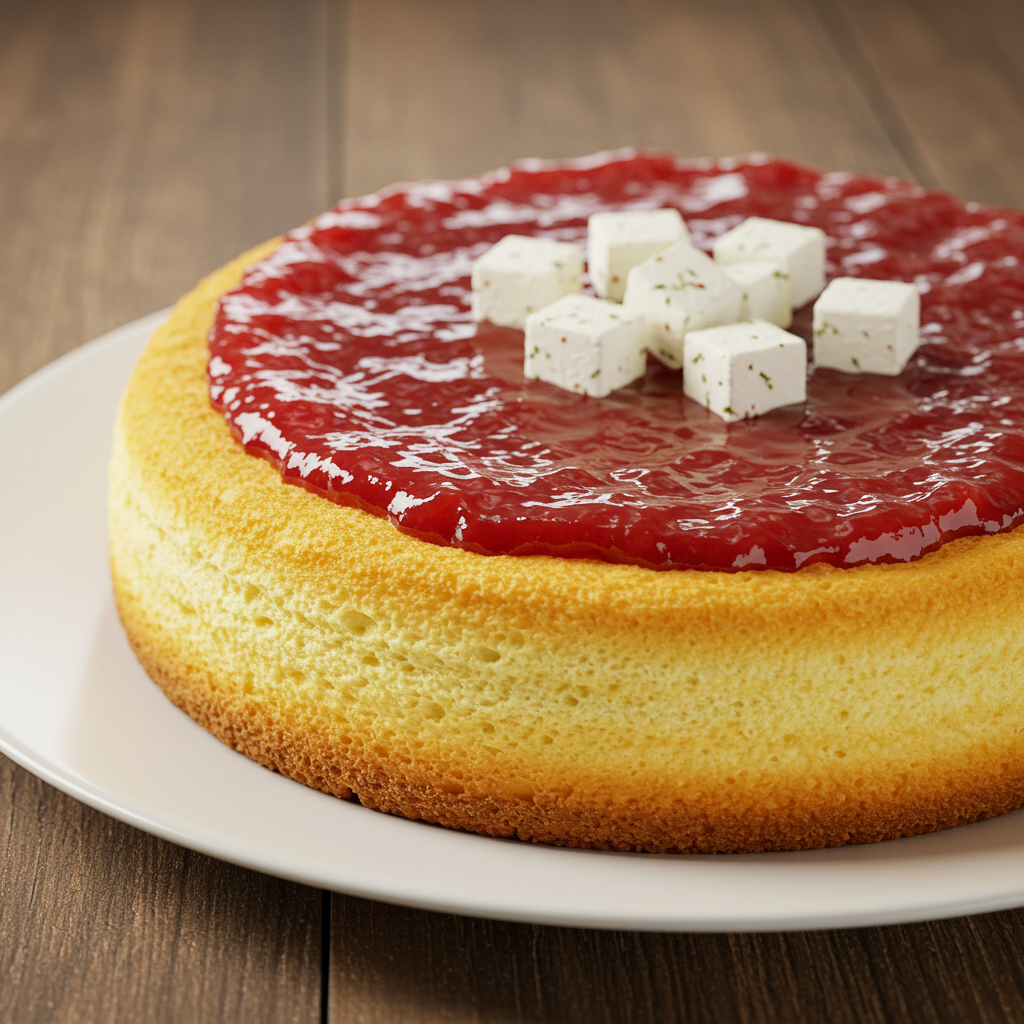 - Após o bolo esfriar, desenforme-o e espalhe a geleia de goiabada sobre a superfície.