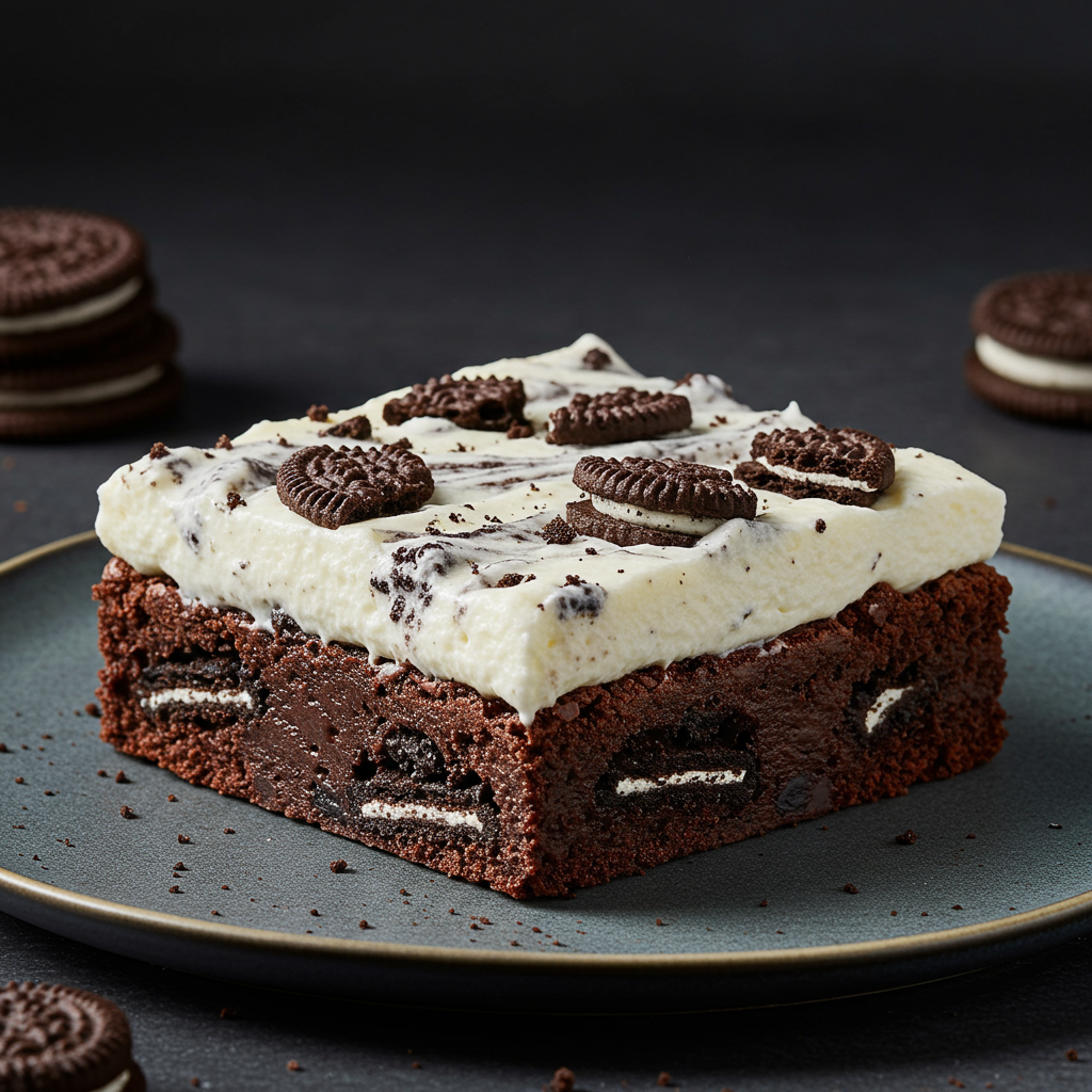 - Finalize: Com o brownie já frio, espalhe a cobertura cremosa por cima. Decore com os biscoitos Oreo esfarelados. Leve à geladeira por pelo menos 1 hora antes de servir.
