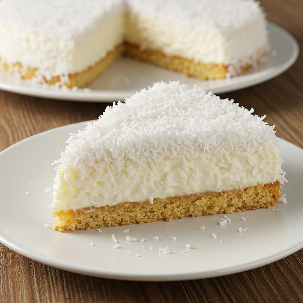 Esta versão da torta de coco combina uma base de biscoito com um recheio de creme de coco incrivelmente macio e úmido, finalizado com uma camada generosa de coco ralado.