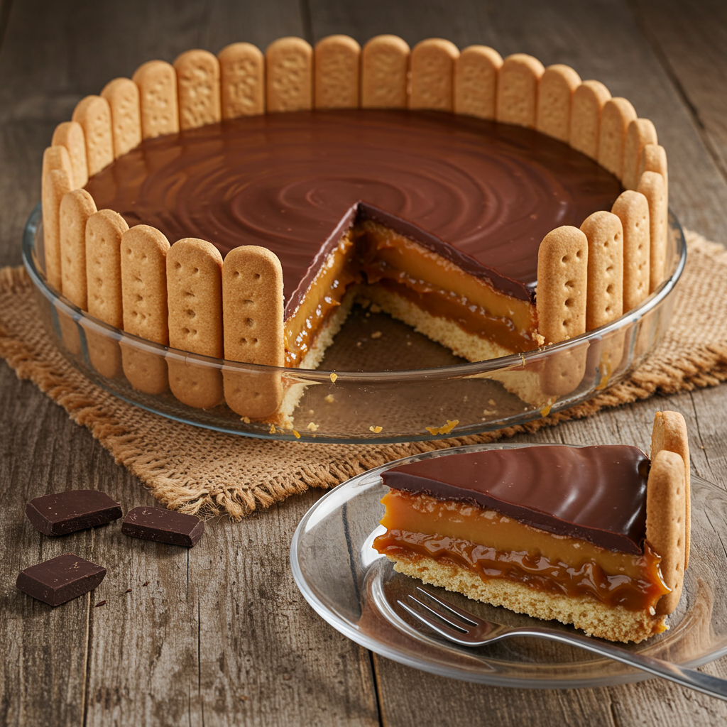 Uma torta com uma base de biscoitos crocante, um recheio aveludado de doce de leite e uma cobertura de ganache de chocolate.